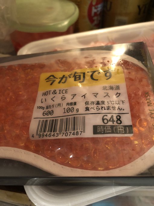 ▼這款眼罩做成了新鮮鮭魚卵的模樣,上面還有「600円」、「100g」、「保存溫度5°C以下」等字樣,非常真實。